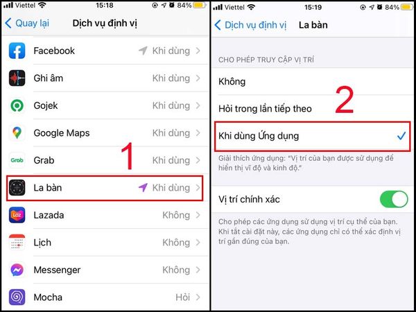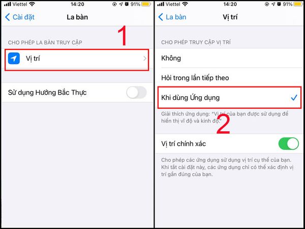 Bước 3: Để cấp quyền truy cập vị trí bạn bấm vào “La bàn” > “Khi dùng ứng dụng”
