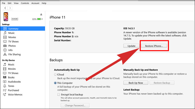 Nếu màn hình vẫn không hiển thị, bạn có thể kết nối iPhone với máy tính và sử dụng iTunes (Windows hoặc macOS Mojave trở xuống) hoặc Finder (macOS Catalina trở lên) để khôi phục cài đặt gốc.