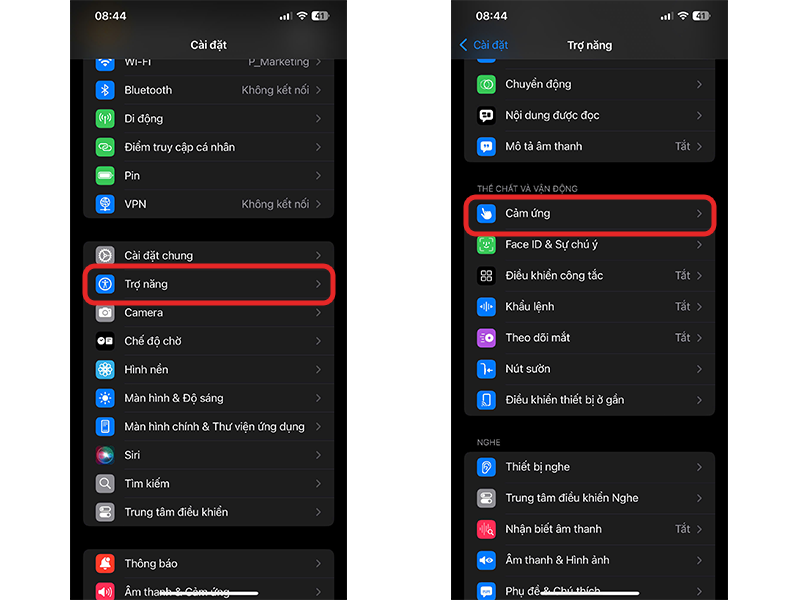 Bước 3: Trong phần mục lục, bạn chọn tiếp vào dòng Cảm ứng (Touch).