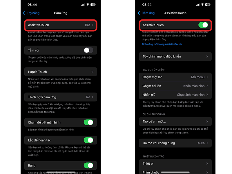 Bước 1: Truy cập vào Cài đặt => Trợ năng => Cảm ứng => AssistiveTouch như hướng dẫn ở trên.