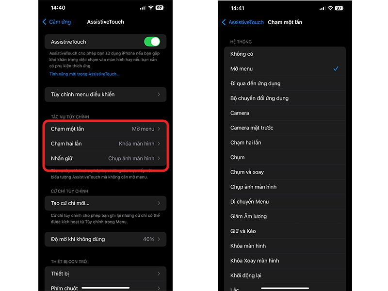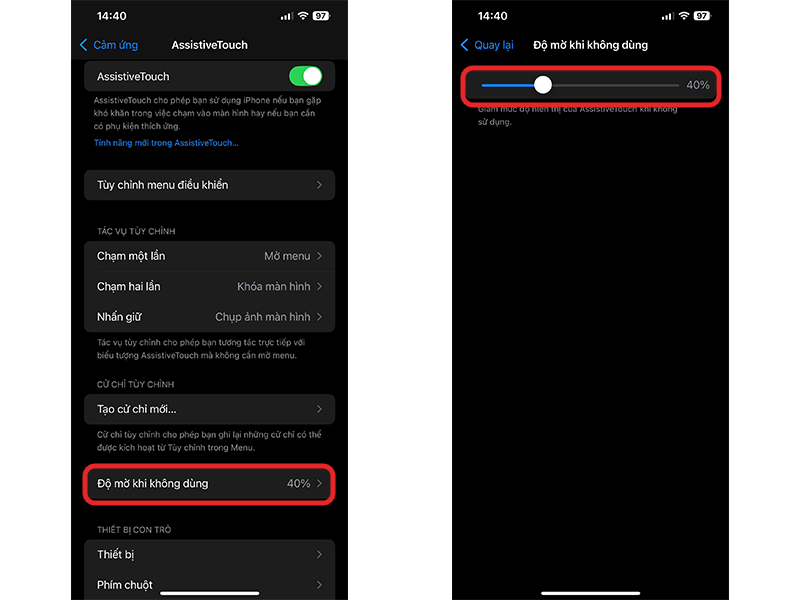 Chỉnh độ mờ khi không dùng: Trong menu AssistiveTouch, chọn mục Độ mờ khi không dùng.