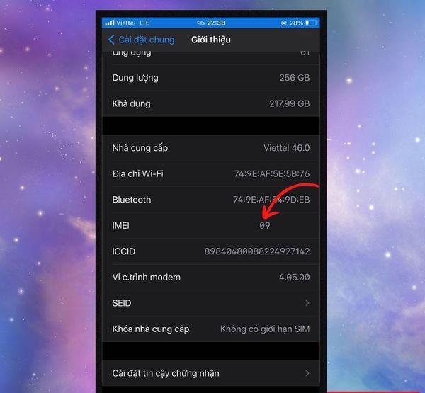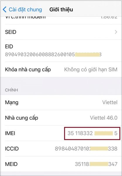 - Xem số IMEI: Kéo xuống dưới và tìm mục "IMEI". Bạn sẽ thấy số IMEI của thiết bị được hiển thị ở đây. Số IMEI là một chuỗi số duy nhất định danh cho thiết bị của bạn.