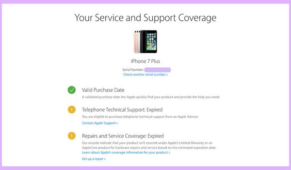 - Repairs and Service Coverage (Chế độ bảo hành và sửa chữa): Trang web sẽ hiển thị thông tin về thời hạn bảo hành của máy. Nếu máy vẫn còn trong thời gian bảo hành, thông tin sẽ được ghi là "Active" kèm theo ngày tháng. Nếu máy đã hết hạn bảo hành, thông tin sẽ hiển thị "Expired" (Hết hạn).