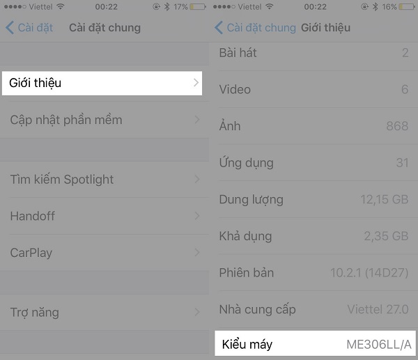 Trước khi check iPhone lock nhà mạng nào, người dùng cần xác định được máy đến từ thị trường nào. Chỉ cần vào Cài đặt -> Cài đặt chung -> Giới thiệu -> Kiểu máy, nếu có ký hiệu LL/A là của Mỹ, J/A là của Nhật.