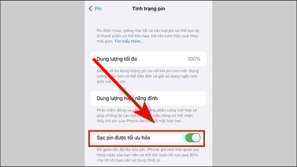 - Bước 2: Sau đó bật Sạc pin được tối ưu hoá bằng cách trượt sang phải.