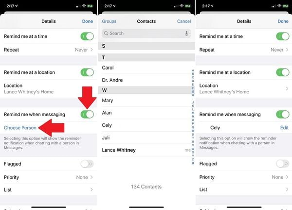 Vậy để có thể làm được như vậy, bạn cần vào Reminder trên iPhone và tạo một lời nhắc mới. Bạn chọn danh sách lời nhắc vừa lập và chọn vào chữ i cạnh đó để mở màn hình chi tiết. Nhấn chọn nút Khi nhắn tin “Remind me when messaging” -> Chọn người bạn muốn nhắn tin từ danh bạ. Thông báo bạn vừa tạo sẽ được xuất hiện khi bạn nhắn tin với người ấy.