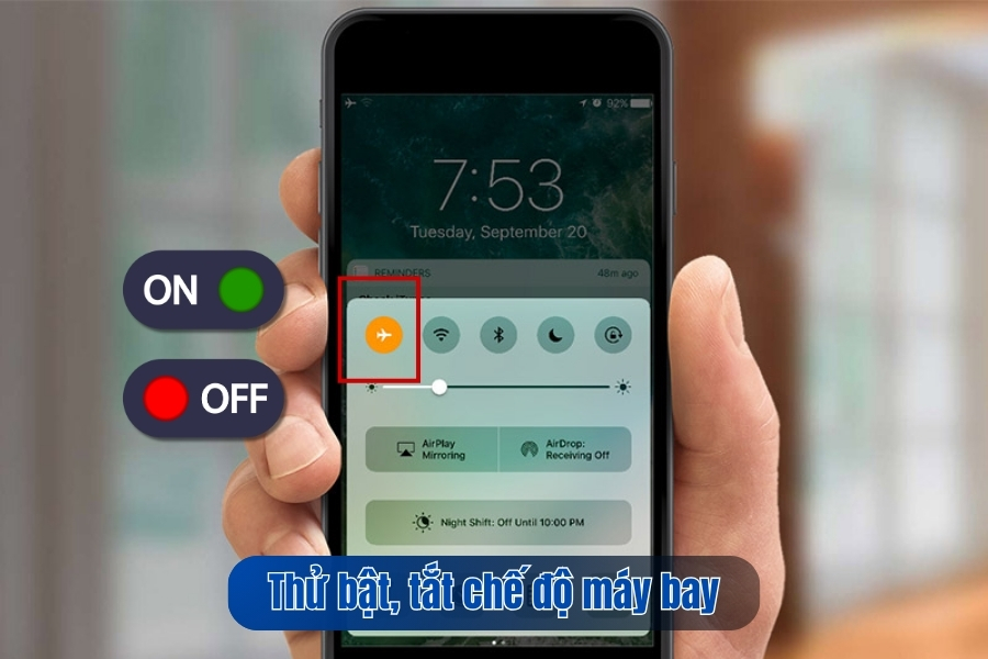Đôi khi, việc bật và tắt chế độ máy bay có thể giúp khôi phục kết nối mạng di động. Bạn chỉ cần bật chế độ máy bay trong vài giây rồi tắt đi, sau đó kiểm tra xem iPhone có nhận SIM không. Phương pháp này rất hữu ích khi điện thoại iPhone mắc các lỗi liên quan đến kết nối mạng bị gián đoạn hoặc gặp sự cố tạm thời.