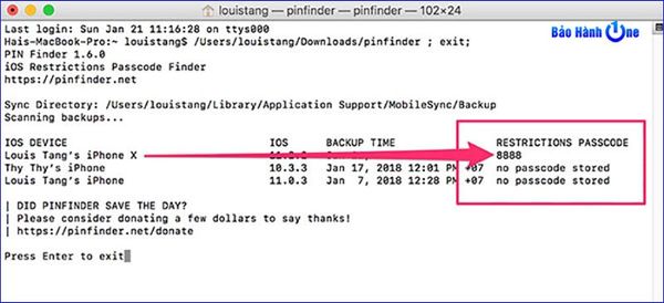 Bước 3: Sau khi Backup ở bước 2 xong, bạn chạy ứng dụng: Pinfinder vừa cài ở bước 1. Sau đó nhập mật khẩu mã hóa, bạn sẽ ngay lập tức nhận được mật khẩu giới hạn của iPhone.