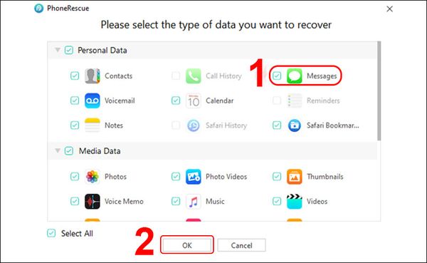 Bước 2: Chọn vào tin nhắn (Messages) --> Chọn nút lệnh "OK" chờ trong vài phút để phần mềm chạy