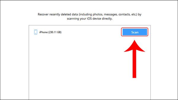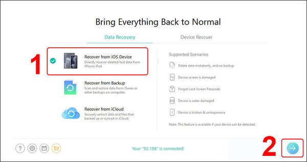 Bước 1: Kết nối điện thoại với máy tính → Chọn "Recover from iOS Device" sau đó chọn mũi tên ở góc phải bên dưới