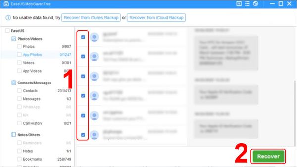 Bước 3: Chọn tin nhắn bạn muốn khôi phục → "Recover" và chờ vài phút để phục hồi tin nhắn