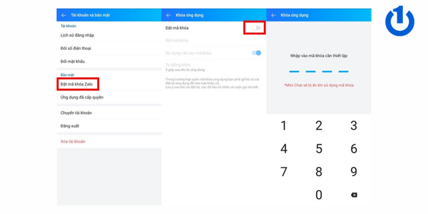Vào Cài đặt Zalo → “Tài khoản và bảo mật” → Chọn vào “Đặt mã khóa Zalo” → Gạt sang phải và nhập mật mã của bạn.