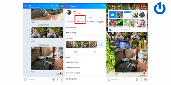 Vào đoạn chat → Chọn biểu tượng 3 chấm góc trên bên phải → Chọn “Đổi hình nền” → Chọn hình ảnh có sẵn hoặc trên thiết bị của bạn và ấn “Xong” để hoàn tất
