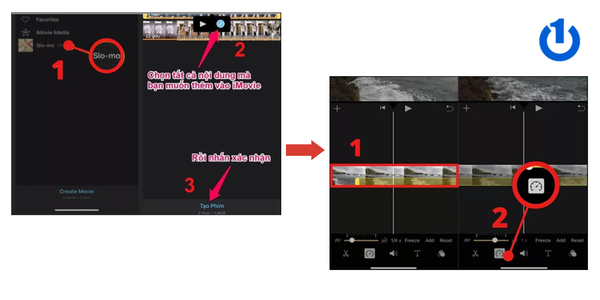 Bước 4: Nhấn vào mục “Slo-mo” và chọn video Slo-mo mà bạn muốn tăng tốc → Nhấn vào dấu tick xanh → Sau đó nhấn vào “Tạo phim”