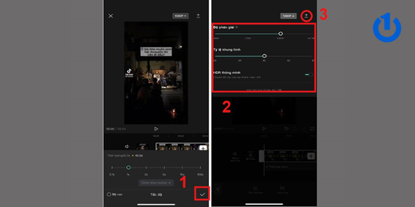 Bước 6: Điều chỉnh độ phân giải, tỷ lệ khung hình và xuất video về thư viện điện thoại bằng cách chọn vào mũi tên đi lên ở góc trên bên phải