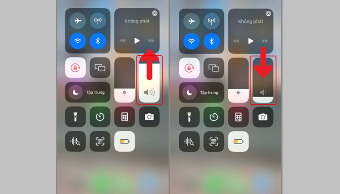 Nếu iPhone không nghe được loa trong, loa ngoài, bạn nhấn nút Tăng âm lượng (+) để đảm bảo âm lượng không bị giảm về mức thấp nhất. Hoặc vào Trung tâm điều khiển bằng cách vuốt từ góc trên bên phải xuống để xem thanh âm lượng có bị tắt không.