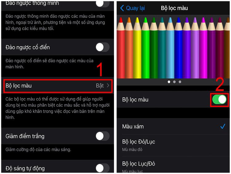 Nếu bạn muốn thử bật chế độ Grayscale (Thang màu xám), hãy bật Bộ lọc màu và chọn tùy chọn Thang màu xám (Grayscale).