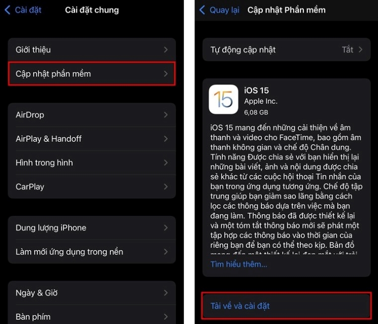 Xem và cập nhật iOS lên phiên bản mới nhất bằng cách vào Cài đặt chọn Cài đặt chung và Cập nhật phần mềm. iPhone sau khi được nâng cấp có thể tránh được các lỗi liên quan đến hiển thị và lỗi ứng dụng chạy chậm.