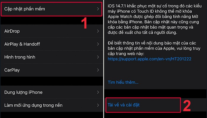 Sau khi hoàn tất chuẩn bị, mọi dữ liệu đã được lưu lại , lúc này bạn cập nhật iOS mới bằng cách vào Cài đặt chọn Cài đặt chung và ấn Cập nhật phần mềm, nếu có phiên bản mới, nhấn Tải về và Cài đặt.