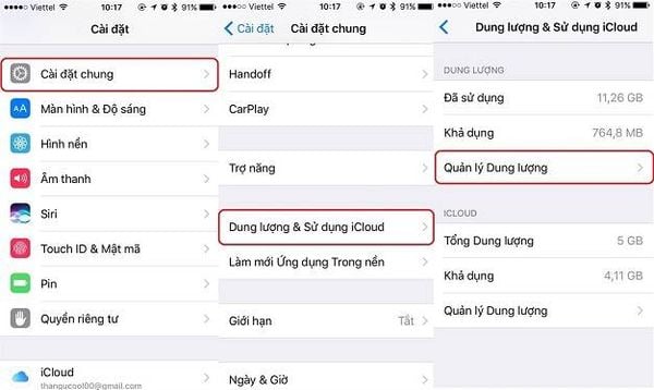Cài đặt chung -> Dung lượng & sử dụng iCloud -> Quản lý dung lượng