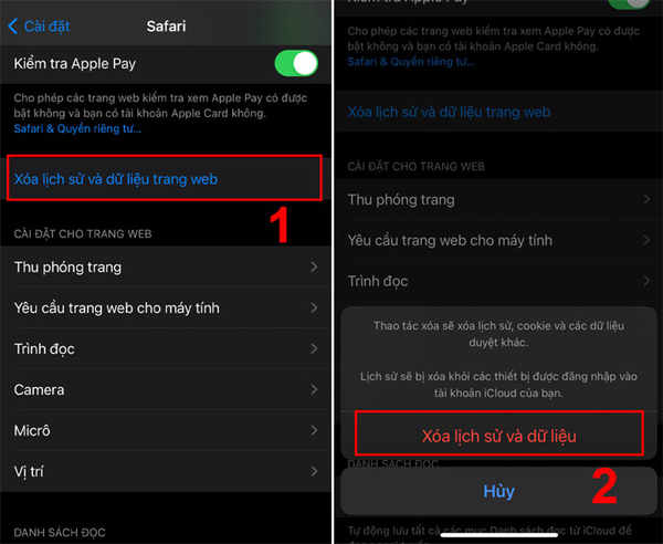 Bước 2: Sau đó vào mục "Xóa lịch sử và dữ liệu trang web" để thực hiện xóa bộ nhớ.