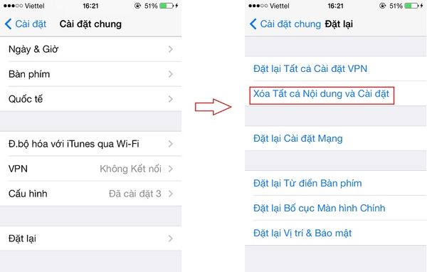 Cài đặt chung -> Xóa tất cả nội dung và cài đặt