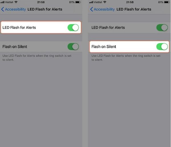 Lưu ý: Nếu bạn muốn để chế độ im lặng nhưng không muốn bỏ lỡ bất kỳ thông báo khẩn cấp quan trọng nào, vui lòng bật tính năng Flash on Silent. Điện thoại iPhone của bạn sẽ nhấp nháy khi có thông báo cuộc gọi đến nhưng không có âm thanh.