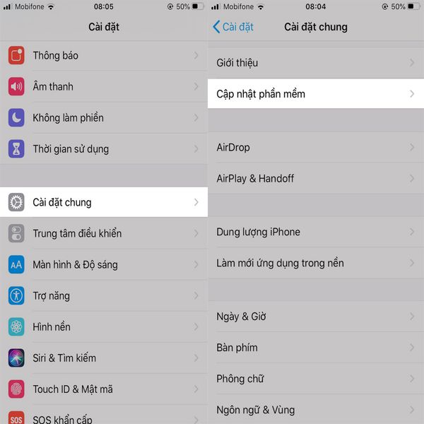 Chạm mục "Cài đặt chung" -> Cuộn xuống và chạm vào "Cập nhật phần mềm"