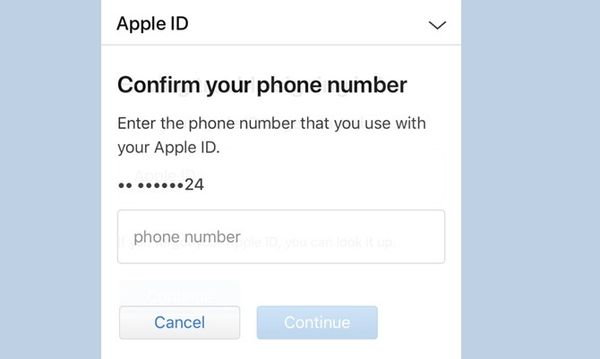 Bước 3: Nhập đúng số điện thoại mà bạn đã sử dụng để đăng kí id apple=> Nhấp vào tiếp tục.