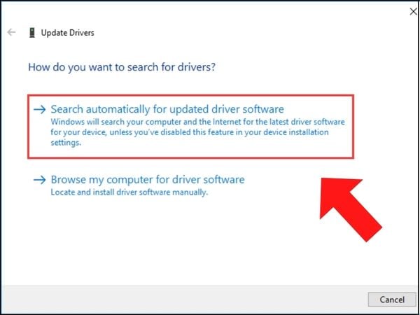 Bấm vào "Search automatically for updated driver software" và chờ cài đặt lại drive