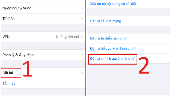 Reset (Đặt lại) -> Reset Location & Privacy (Đặt lại vị trí & quyền riêng tư)