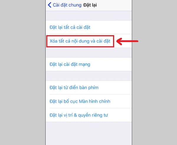 Chọn "Xóa tất cả nội dung và cài đặt"