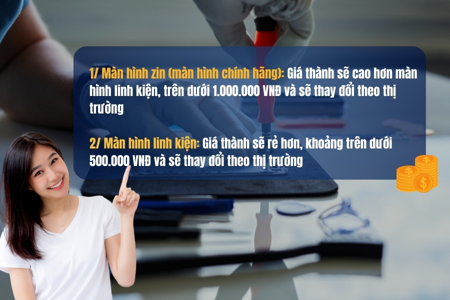 Màn hình zin (màn hình chính hãng): Giá thành sẽ cao hơn màn hình linh kiện, trên dưới 1.000.000 VNĐ và dao động theo thị trường. Đầu tư vào màn hình chính hãng sẽ đảm bảo chất lượng tốt, độ bền cao, và ít xảy ra lỗi hơn sau khi thay thế.