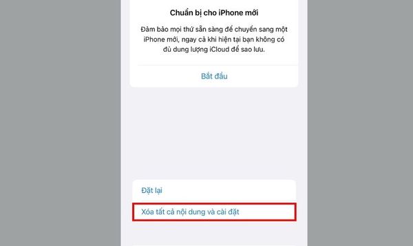 Chọn "Xóa tất cả nội dung và cài đặt"