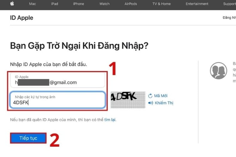 Nhập email đã dùng để đăng ký ID Apple nhấn “Tiếp tục”