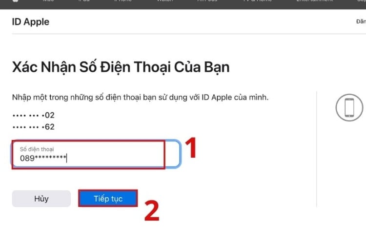 Nhập số điện thoại đã đăng ký với ID Apple rồi nhấn “Tiếp tục”