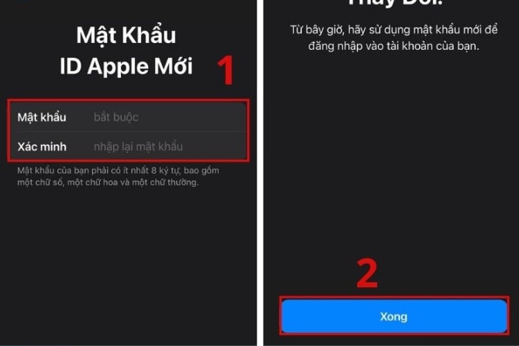 Bước 5: Nhập mật khẩu iCloud mới nhấn “Tiếp theo”. Cuối cùng, nhấn chọn vào “Xong” để hoàn tất quá trình đổi mật khẩu.