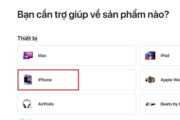 Bước 1: Truy cập vào trang hỗ trợ Apple (tại đây) nhấn chọn vào ngôn ngữ Tiếng Việt. Sau đó, nhấn vào mục “Chọn một sản phẩm”.