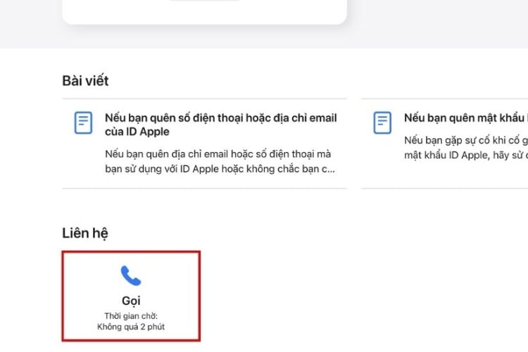 Bước 5: Ở mục “Liên hệ” chọn “Gọi” để nhận sự hỗ trợ trực tiếp từ đội ngũ nhân viên Apple.