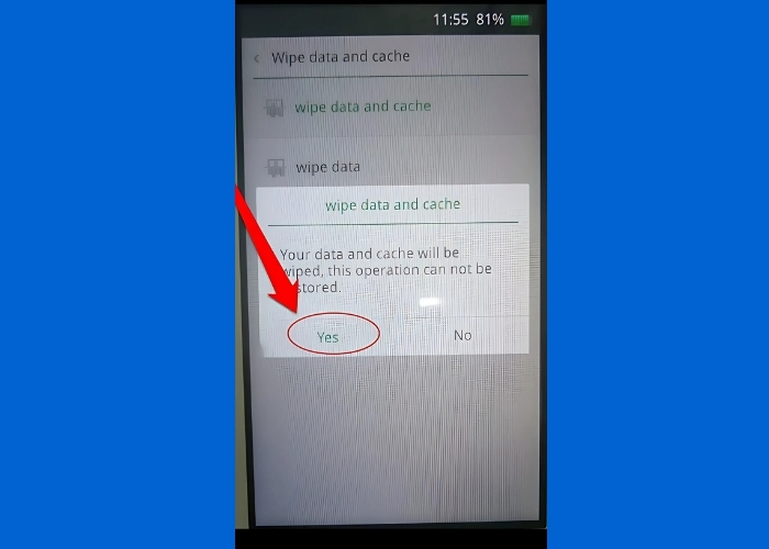 Bước 3: Nếu trên màn hình xuất hiện tuỳ chọn “Wipe data and cache” thì nhấn vào và chọn “Yes”.