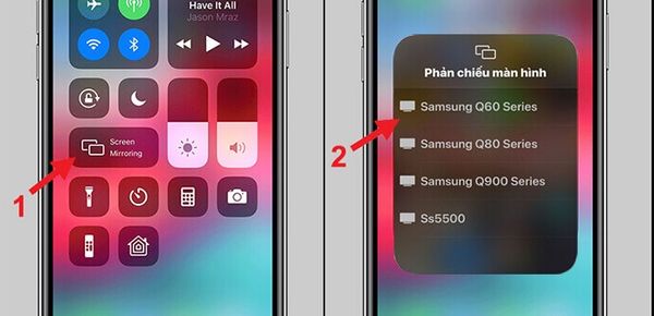 Trên điện thoại iPhone chọn mục "Phản chiếu màn hình", sau đó chọn tivi của bạn để kết nối