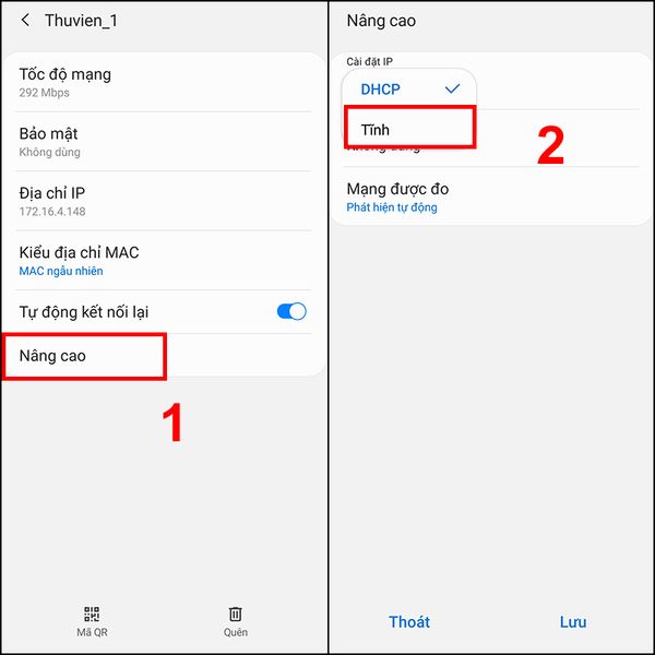 Bước 3: Tại Cài đặt IP -> Cài đặt "Nâng cao" -> chọn "Tĩnh".