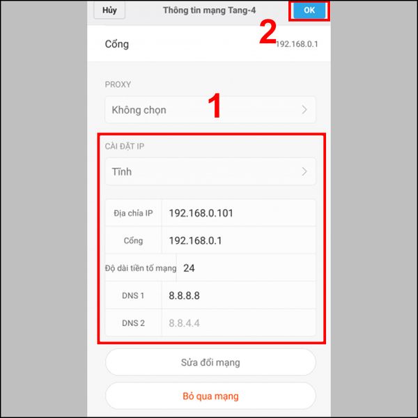 Bước 4: Cài đặt lại Gateway và DNS -> "OK".