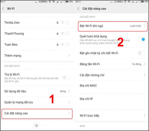 Bước 2: Bấm vào "Cài đặt nâng cao", sau đó bật tùy chọn Wifi khi ngủ và chọn "Luôn luôn" để wifi luôn hoạt động.