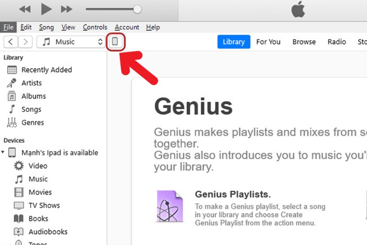 Bước 2: Mở ứng dụng “iTunes” trên máy tính của bạn sau đó chọn biểu tượng điện iPad khi iTunes nhận diện thiết bị.