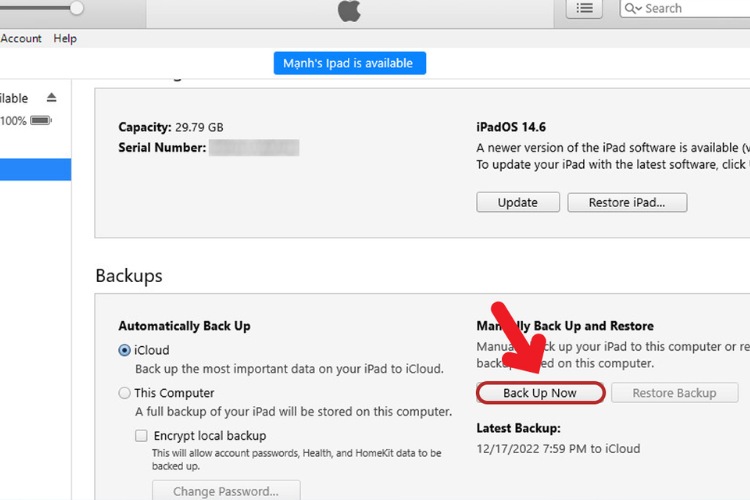 Bước 3: Nhấn vào tùy chọn “Back up now” để sao lưu dữ liệu hiện tại trên iPad của bạn.