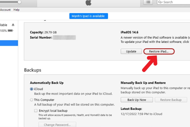 Bước 4: Sau khi quá trình sao lưu hoàn tất, bạn tiếp tục nhấn vào “Restore iPad” để tiến hành khôi phục lại thiết bị về trạng thái ban đầu.