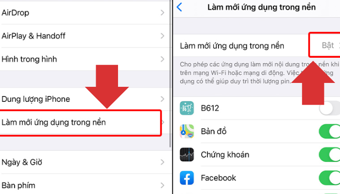 Tiếp theo, tắt chế độ Làm mới ứng dụng trong nền từ mục Cài đặt, đi đến Cài đặt chung chọn Làm mới ứng dụng trong nền và ấn Tắt.