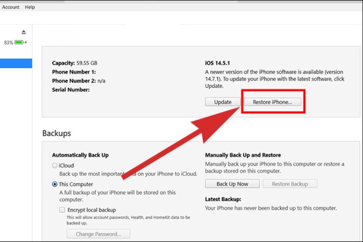 Bước 3: Nếu không cần sao lưu dữ liệu nhấn vào Restore iPhone. Còn cần sao lưu chọn vào “Back Up Now” tiếp tục chọn “iCloud” hoặc “This Computer” để lưu trữ bản sao.