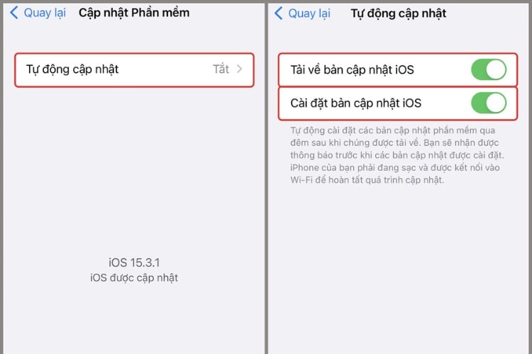 Bước 5: Bạn có thể lựa chọn “Tự động tải về” và “Cài đặt” các bản cập nhật mới nhất để đảm bảo iPhone luôn chạy phiên bản iOS mới nhất giúp tránh các lỗi phần mềm tiềm ẩn.
